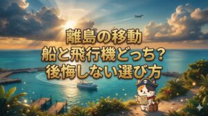 飛行機でも船でも、島への移動はなるべく「午前中の早い便」を選ぶと有利な場合が多いです。天候は午後になるにつれて荒れることが多く、欠航時のリカバリーも午前便の方が有利だからです(※航路や季節で例外もあるため最終判断は予報を優先します)。